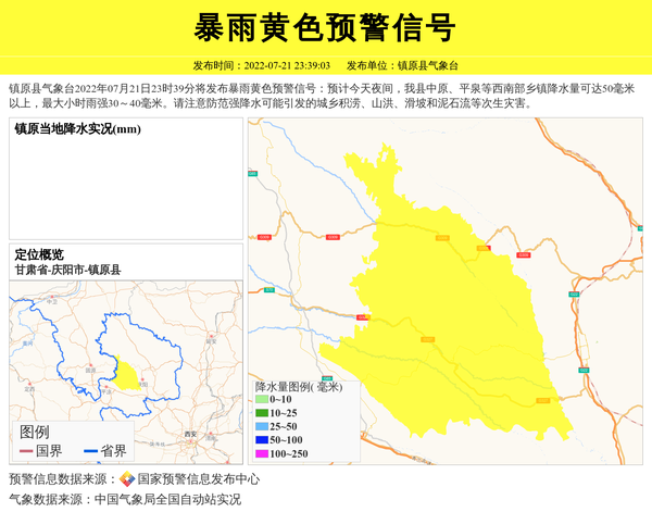 镇原县气象台2022年07月21日23时39分将发布暴雨黄色预警信号:预计今天夜间,我县中原、平泉等西南部乡镇降水量可达50毫米以上,最大小时雨强30~40毫米。请注意防范强降水可能引发的城乡积涝、山洪、滑坡和泥石流等次生灾害。 信息来源:国家预警信息发布中心; 发布单位:镇原县气象台。