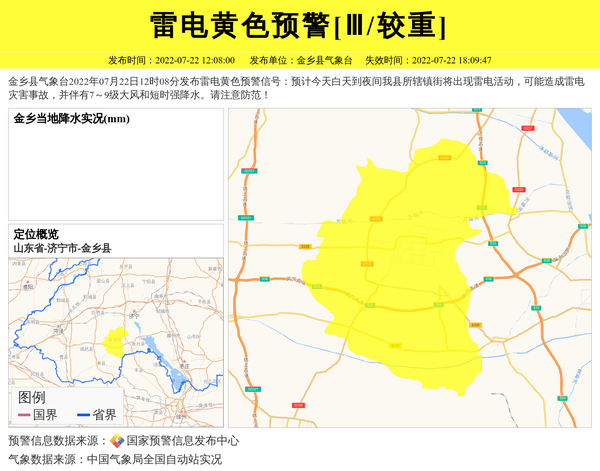 金乡县气象台2022年07月22日12时08分发布雷电黄色预警信号:预计今天白天到夜间我县所辖镇街将出现雷电活动,可能造成雷电灾害事故,并伴有7~9级大风和短时强降水。请注意防范! 信息来源:国家预警信息发布中心; 发布单位:金乡县气象台。