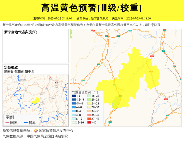 新宁县气象台2022年7月22日8时18分发布高温黄色预警信号:今天白天新宁县最高气温将升至35℃以上,请注意防范。 信息来源:国家预警信息发布中心; 发布单位:新宁县气象局。