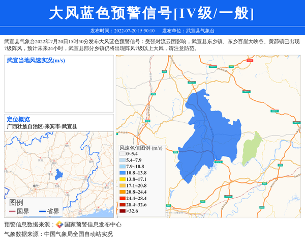 武宣县气象台2022年7月20日15时50分发布大风蓝色预警信号:受强对流云团影响,武宣县东乡镇、东乡百崖大峡谷、黄茆镇已出现7级阵风,预计未来24小时,武宣县部分乡镇仍将出现阵风7级以上大风,请注意防范。 信息来源:国家预警信息发布中心; 发布单位:武宣县气象台。