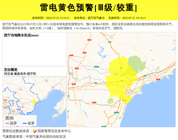 抚宁区气象台2022年07月21日13时11分发布雷电黄色预警信号:预计未来6小时内,我区全部乡镇将出现分散性阵雨或雷阵雨天气,降雨时将伴有雷电、短时大风(7-8级)、短时强降水(10-20mm/h)等强对流天气,请防范。 信息来源:国家预警信息发布中心; 发布单位:抚宁区气象台。
