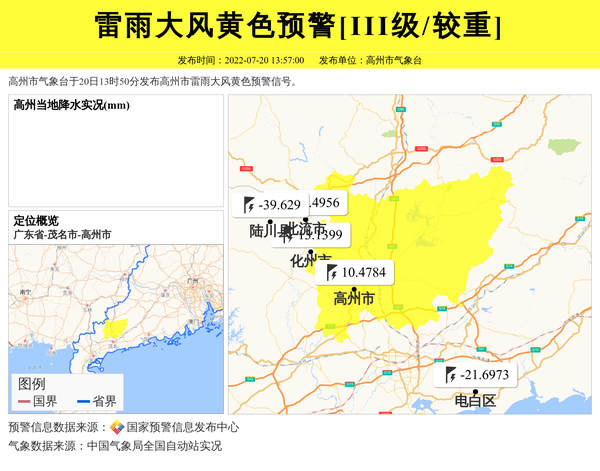 高州市气象台于20日13时50分发布高州市雷雨大风黄色预警信号。 信息来源:国家预警信息发布中心; 发布单位:高州市气象台。