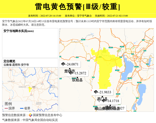 安宁市气象台2022年07月20日14时15分发布雷电黄色预警信号:预计未来12小时内安宁市范围内将有明显雷电活动,并伴有短时强降水、冰雹或瞬时大风。请注意防范。 信息来源:国家预警信息发布中心; 发布单位:安宁市气象台。