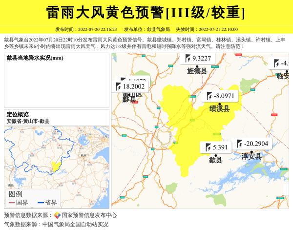 歙县气象台2022年07月20日22时10分发布雷雨大风黄色预警信号。歙县徽城镇、郑村镇、富堨镇、桂林镇、溪头镇、许村镇、上丰乡等乡镇未来6小时内将出现雷雨大风天气,风力达7-8级并伴有雷电和短时强降水等强对流天气。请注意防范! 信息来源:国家预警信息发布中心; 发布单位:歙县气象局。