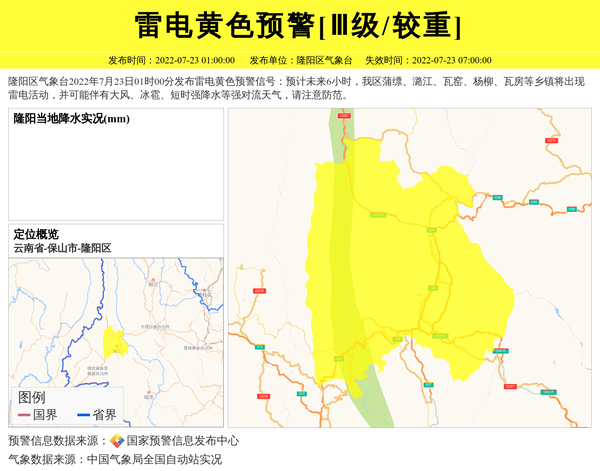 隆阳区气象台2022年7月23日01时00分发布雷电黄色预警信号:预计未来6小时,我区蒲缥、潞江、瓦窑、杨柳、瓦房等乡镇将出现雷电活动,并可能伴有大风、冰雹、短时强降水等强对流天气,请注意防范。 信息来源:国家预警信息发布中心; 发布单位:隆阳区气象台。