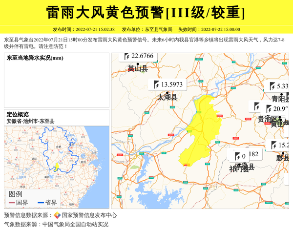 东至县气象台2022年07月21日15时00分发布雷雨大风黄色预警信号。未来6小时内我县官港等乡镇将出现雷雨大风天气,风力达7-8级并伴有雷电。请注意防范! 信息来源:国家预警信息发布中心; 发布单位:东至县气象局。