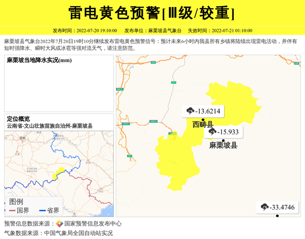 麻栗坡县气象台2022年7月20日19时10分继续发布雷电黄色预警信号:预计未来6小时内我县所有乡镇将陆续出现雷电活动,并伴有短时强降水、瞬时大风或冰雹等强对流天气,请注意防范。 信息来源:国家预警信息发布中心; 发布单位:麻栗坡县气象台。