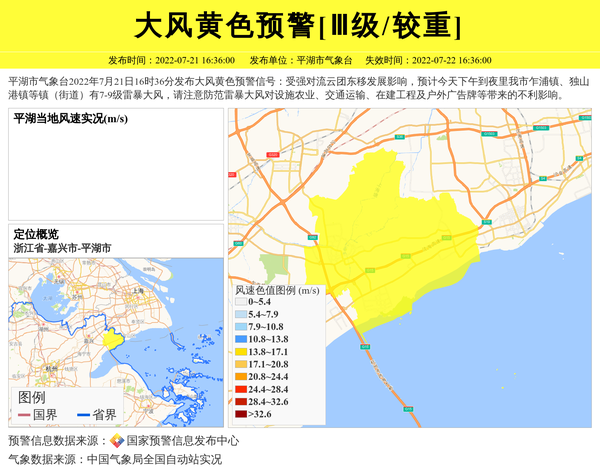 平湖市气象台2022年7月21日16时36分发布大风黄色预警信号:受强对流云团东移发展影响,预计今天下午到夜里我市乍浦镇、独山港镇等镇(街道)有7-9级雷暴大风,请注意防范雷暴大风对设施农业、交通运输、在建工程及户外广告牌等带来的不利影响。 信息来源:国家预警信息发布中心; 发布单位:平湖市气象台。