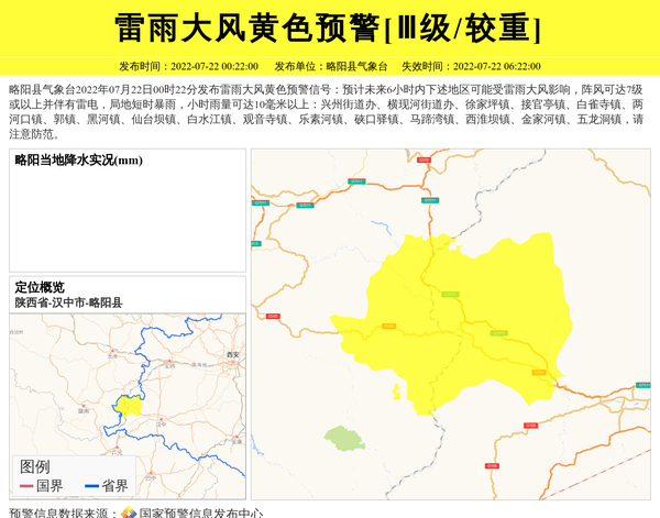 略阳县气象台2022年07月22日00时22分发布雷雨大风黄色预警信号:预计未来6小时内下述地区可能受雷雨大风影响,阵风可达7级或以上并伴有雷电,局地短时暴雨,小时雨量可达10毫米以上:兴州街道办、横现河街道办、徐家坪镇、接官亭镇、白雀寺镇、两河口镇、郭镇、黑河镇、仙台坝镇、白水江镇、观音寺镇、乐素河镇、硖口驿镇、马蹄湾镇、西淮坝镇、金家河镇、五龙洞镇,请注意防范。 信息来源:国家预警信息发布中心; 发布单位:略阳县气象台。