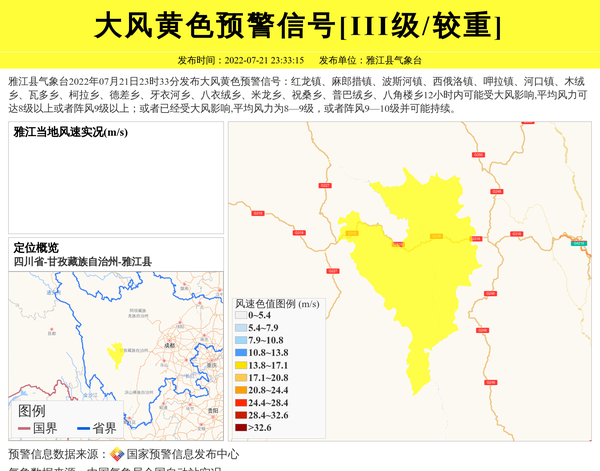 雅江县气象台2022年07月21日23时33分发布大风黄色预警信号:红龙镇、麻郎措镇、波斯河镇、西俄洛镇、呷拉镇、河口镇、木绒乡、瓦多乡、柯拉乡、德差乡、牙衣河乡、八衣绒乡、米龙乡、祝桑乡、普巴绒乡、八角楼乡12小时内可能受大风影响,平均风力可达8级以上或者阵风9级以上;或者已经受大风影响,平均风力为8—9级,或者阵风9—10级并可能持续。 信息来源:国家预警信息发布中心; 发布单位:雅江县气象台。