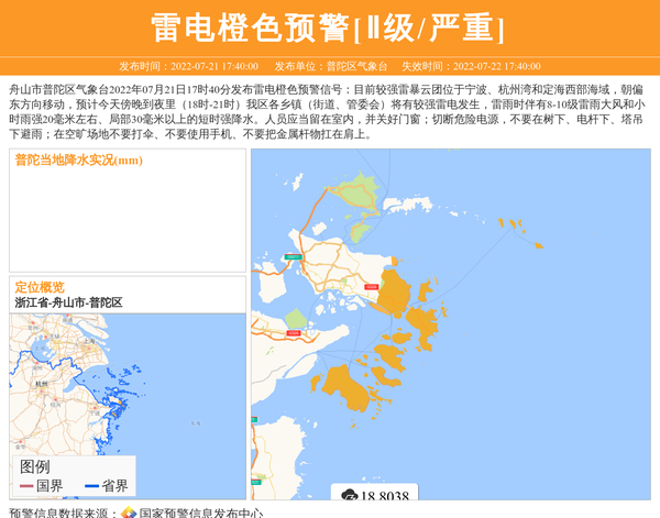 舟山市普陀区气象台2022年07月21日17时40分发布雷电橙色预警信号:目前较强雷暴云团位于宁波、杭州湾和定海西部海域,朝偏东方向移动,预计今天傍晚到夜里(18时-21时)我区各乡镇(街道、管委会)将有较强雷电发生,雷雨时伴有8-10级雷雨大风和小时雨强20毫米左右、局部30毫米以上的短时强降水。人员应当留在室内,并关好门窗;切断危险电源,不要在树下、电杆下、塔吊下避雨;在空旷场地不要打伞、不要使用手机、不要把金属杆物扛在肩上。 信息来源:国家预警信息发布中心; 发布单位:普陀区气象台。