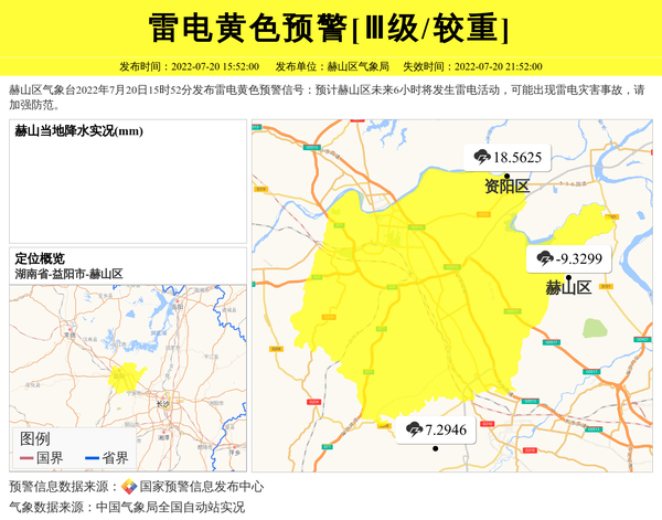 赫山区气象台2022年7月20日15时52分发布雷电黄色预警信号:预计赫山区未来6小时将发生雷电活动,可能出现雷电灾害事故,请加强防范。 信息来源:国家预警信息发布中心; 发布单位:赫山区气象局。