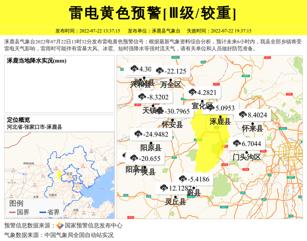 涿鹿县气象台2022年07月22日13时32分发布雷电黄色预警信号:根据最新气象资料综合分析,预计未来6小时内,我县全部乡镇将受雷电天气影响,雷雨时可能伴有雷暴大风、冰雹、短时强降水等强对流天气,请有关单位和人员做好防范准备。 信息来源:国家预警信息发布中心; 发布单位:涿鹿县气象台。
