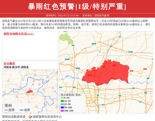 原阳县气象台2022年07月22日13时32分将暴雨黄色预警信号升级为暴雨红色预警信号:过去3小时我县已出现20-80毫米以上的降水,最大雨量为农科所85.4毫米。预计未来3小时内我县靳堂、阳和、福宁集、葛埠口等乡镇和街道降水量将达100毫米以上,请注意防范强降雨引发的中小河流洪水、城市内涝、农田积水等次生灾害。 信息来源:国家预警信息发布中心; 发布单位:原阳县气象局。