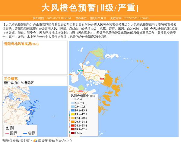 【大风橙色预警信号】舟山市普陀区气象台2022年07月21日18时50分将大风黄色预警信号升级为大风橙色预警信号:受较强雷暴云团影响,普陀沿海已出现8-10级雷雨大风(蚂蚁、点灯山、蛏子港10级,桃花、虾峙、东闪、白沙9级),预计今天21时前我区沿海(含各镇、街道、管委会)风力还将持续增强到9-11级(风向西北)。希处于危险地带及出海的船只做好避风工作,并注意交通安全,高空、滩涂、水上等户外作业人员停止作业,危险的户外电源应及时切断。 信息来源:国家预警信息发布中心; 发布单位:普陀区气象台。