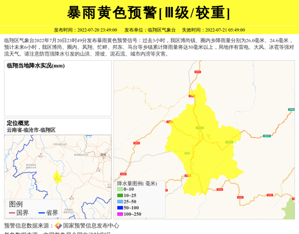 临翔区气象台2022年7月20日23时49分发布暴雨黄色预警信号:过去3小时,我区博尚镇、圈内乡降雨量分别为26.0毫米、24.6毫米,预计未来6小时,我区博尚、圈内、凤翔、忙畔、邦东、马台等乡镇累计降雨量将达50毫米以上,局地伴有雷电、大风、冰雹等强对流天气。请注意防范强降水引发的山洪、滑坡、泥石流、城市内涝等灾害。 信息来源:国家预警信息发布中心; 发布单位:临翔区气象台。