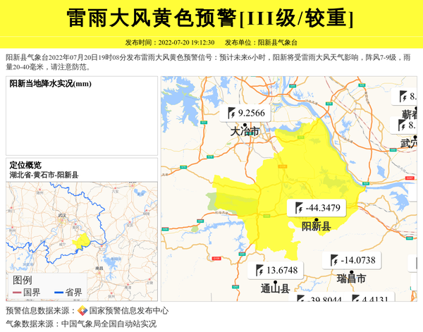 阳新县气象台2022年07月20日19时08分发布雷雨大风黄色预警信号:预计未来6小时,阳新将受雷雨大风天气影响,阵风7-9级,雨量20-40毫米,请注意防范。 信息来源:国家预警信息发布中心; 发布单位:阳新县气象台。