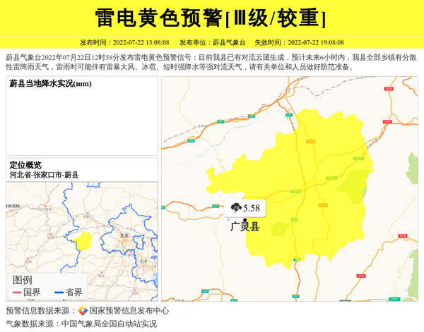 蔚县气象台2022年07月22日12时58分发布雷电黄色预警信号:目前我县已有对流云团生成,预计未来6小时内,我县全部乡镇有分散性雷阵雨天气,雷雨时可能伴有雷暴大风、冰雹、短时强降水等强对流天气,请有关单位和人员做好防范准备。 信息来源:国家预警信息发布中心; 发布单位:蔚县气象台。