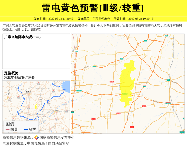 广宗县气象台2022年07月22日13时29分发布雷电黄色预警信号:预计今天下午到夜间,我县全部乡镇有雷阵雨天气,局地伴有短时强降水、短时大风。请防范! 信息来源:国家预警信息发布中心; 发布单位:广宗县气象台。