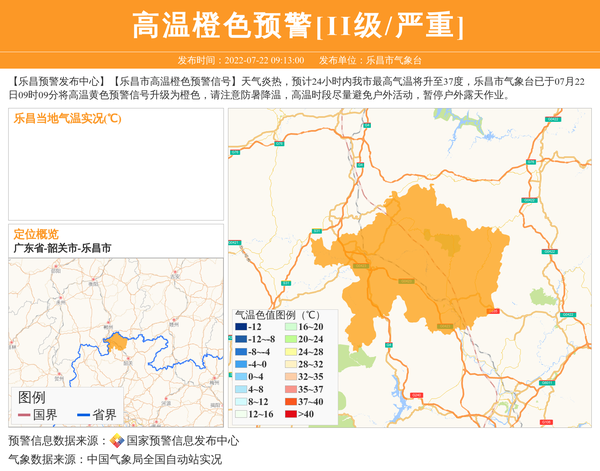 【乐昌预警发布中心】【乐昌市高温橙色预警信号】天气炎热,预计24小时内我市最高气温将升至37度,乐昌市气象台已于07月22日09时09分将高温黄色预警信号升级为橙色,请注意防暑降温,高温时段尽量避免户外活动,暂停户外露天作业。 信息来源:国家预警信息发布中心; 发布单位:乐昌市气象台。