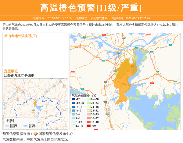 庐山市气象台2022年07月22日14时22分变更高温橙色预警信号:预计未来24小时内,我市大部分乡镇最高气温将达37°C以上,请注意防暑降温。 信息来源:国家预警信息发布中心; 发布单位:庐山市气象局。