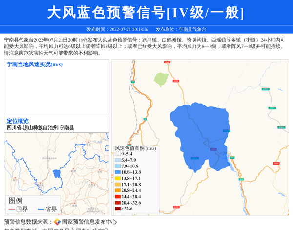 宁南县气象台2022年07月21日20时18分发布大风蓝色预警信号:跑马镇、白鹤滩镇、骑骡沟镇、西瑶镇等乡镇(街道)24小时内可能受大风影响,平均风力可达6级以上或者阵风7级以上;或者已经受大风影响,平均风力为6—7级,或者阵风7—8级并可能持续。请注意防范灾害性天气可能带来的不利影响。 信息来源:国家预警信息发布中心; 发布单位:宁南县气象台。