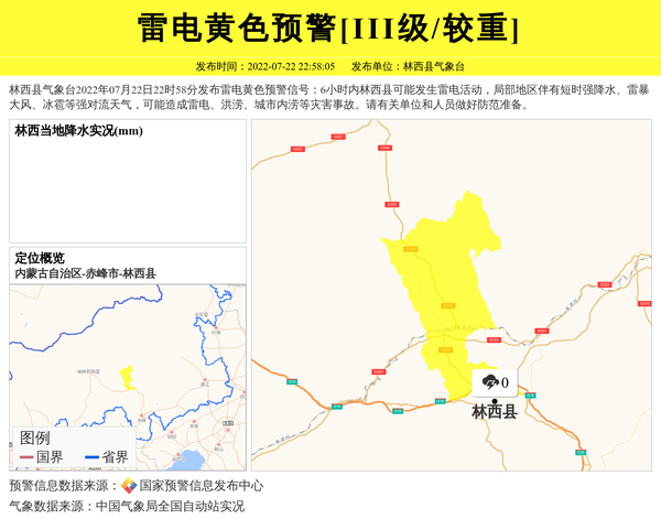 林西县气象台2022年07月22日22时58分发布雷电黄色预警信号:6小时内林西县可能发生雷电活动,局部地区伴有短时强降水、雷暴大风、冰雹等强对流天气,可能造成雷电、洪涝、城市内涝等灾害事故。请有关单位和人员做好防范准备。 信息来源:国家预警信息发布中心; 发布单位:林西县气象台。