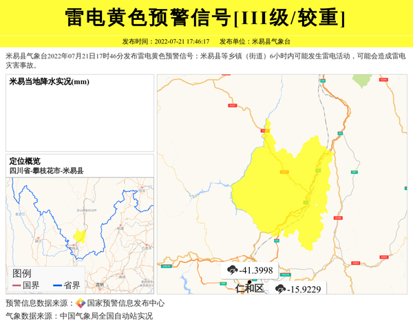 米易县气象台2022年07月21日17时46分发布雷电黄色预警信号:米易县等乡镇(街道)6小时内可能发生雷电活动,可能会造成雷电灾害事故。 信息来源:国家预警信息发布中心; 发布单位:米易县气象台。