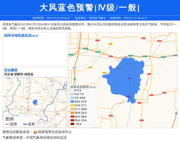 鸡泽县气象台2022年07月22日09时47分发布大风蓝色预警信号:预计今天白天到夜间我县全部乡镇将受大风天气影响,平均风力5~6级,阵风7~8级,请有关单位和人员做好防范准备。 信息来源:国家预警信息发布中心; 发布单位:鸡泽县气象台。