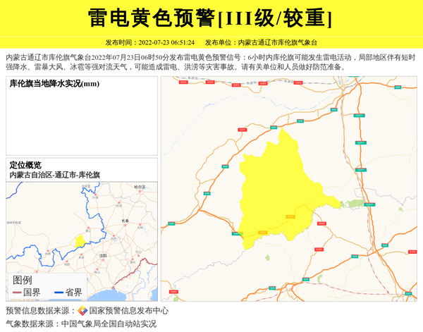 内蒙古通辽市库伦旗气象台2022年07月23日06时50分发布雷电黄色预警信号:6小时内库伦旗可能发生雷电活动,局部地区伴有短时强降水、雷暴大风、冰雹等强对流天气,可能造成雷电、洪涝等灾害事故。请有关单位和人员做好防范准备。 信息来源:国家预警信息发布中心; 发布单位:内蒙古通辽市库伦旗气象台。