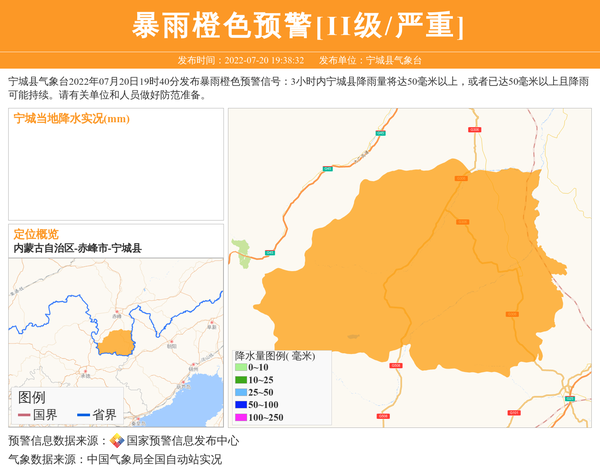 宁城县气象台2022年07月20日19时40分发布暴雨橙色预警信号:3小时内宁城县降雨量将达50毫米以上,或者已达50毫米以上且降雨可能持续。请有关单位和人员做好防范准备。 信息来源:国家预警信息发布中心; 发布单位:宁城县气象台。