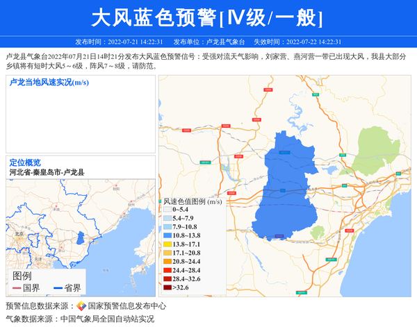 卢龙县气象台2022年07月21日14时21分发布大风蓝色预警信号:受强对流天气影响,刘家营、燕河营一带已出现大风,我县大部分乡镇将有短时大风5~6级,阵风7~8级,请防范。 信息来源:国家预警信息发布中心; 发布单位:卢龙县气象台。