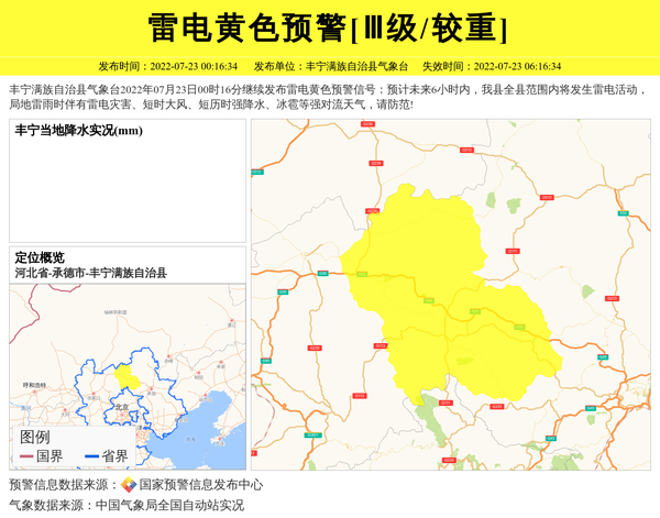 丰宁满族自治县气象台2022年07月23日00时16分继续发布雷电黄色预警信号:预计未来6小时内,我县全县范围内将发生雷电活动,局地雷雨时伴有雷电灾害、短时大风、短历时强降水、冰雹等强对流天气,请防范! 信息来源:国家预警信息发布中心; 发布单位:丰宁满族自治县气象台。