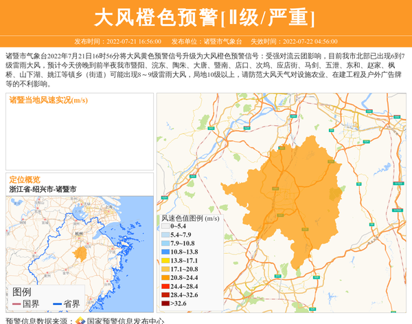 诸暨市气象台2022年7月21日16时56分将大风黄色预警信号升级为大风橙色预警信号:受强对流云团影响,目前我市北部已出现6到7级雷雨大风,预计今天傍晚到前半夜我市暨阳、浣东、陶朱、大唐、暨南、店口、次坞、应店街、马剑、五泄、东和、赵家、枫桥、山下湖、姚江等镇乡(街道)可能出现8~9级雷雨大风,局地10级以上,请防范大风天气对设施农业、在建工程及户外广告牌等的不利影响。 信息来源:国家预警信息发布中心; 发布单位:诸暨市气象台。