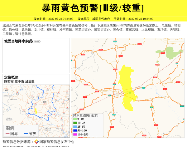 城固县气象台2022年07月22日04时34分发布暴雨黄色预警信号:预计下述地区未来6小时内降雨量将达50毫米以上:老庄镇、桔园镇、原公镇、龙头镇、文川镇、柳林镇、沙河营镇、莲花街道办、博望街道办、三合镇、董家营镇、上元观镇、五堵镇、天明镇、二里镇,请注意防范。 信息来源:国家预警信息发布中心; 发布单位:城固县气象台。