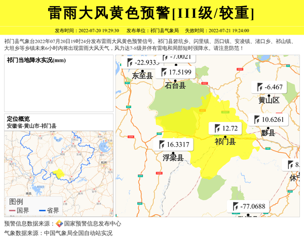 祁门县气象台2022年07月20日19时24分发布雷雨大风黄色预警信号。祁门县箬坑乡、闪里镇、历口镇、安凌镇、渚口乡、祁山镇、大坦乡等乡镇未来6小时内将出现雷雨大风天气,风力达7-8级并伴有雷电和局部短时强降水。请注意防范! 信息来源:国家预警信息发布中心; 发布单位:祁门县气象局。