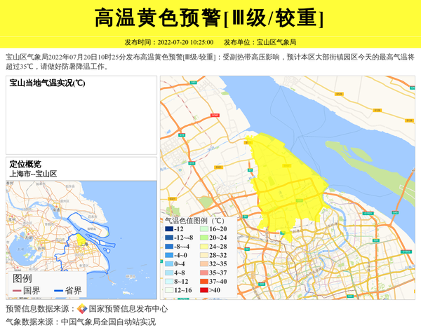 宝山区气象局2022年07月20日10时25分发布高温黄色预警[Ⅲ级/较重]:受副热带高压影响,预计本区大部街镇园区今天的最高气温将超过35℃,请做好防暑降温工作。 信息来源:国家预警信息发布中心; 发布单位:宝山区气象局。
