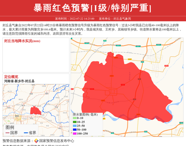 封丘县气象台2022年07月22日14时25分将暴雨橙色预警信号升级为暴雨红色预警信号:过去3小时我县已出现40-100毫米以上的降水,最大累计雨量为荆隆宫乡108.6毫米。预计未来3小时内,我县城关镇、王村乡、居厢镇等乡镇、街道降水量将达100毫米以上,请注意防范强降雨引发的城市内涝、农田渍涝等次生灾害。 信息来源:国家预警信息发布中心; 发布单位:封丘县气象局。