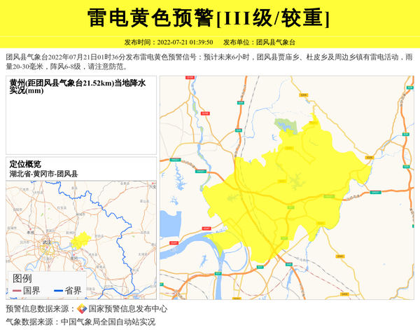 团风县气象台2022年07月21日01时36分发布雷电黄色预警信号:预计未来6小时,团风县贾庙乡、杜皮乡及周边乡镇有雷电活动,雨量20-30毫米,阵风6-8级,请注意防范。 信息来源:国家预警信息发布中心; 发布单位:团风县气象台。