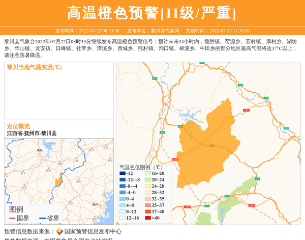 黎川县气象台2022年07月22日08时33分继续发布高温橙色预警信号:预计未来24小时内,德胜镇、荷源乡、宏村镇、厚村乡、湖坊乡、华山镇、龙安镇、日峰镇、社苹乡、潭溪乡、西城乡、熊村镇、洵口镇、樟溪乡、中田乡的部分地区最高气温将达37°C以上,请注意防暑降温。 信息来源:国家预警信息发布中心; 发布单位:黎川县气象局。