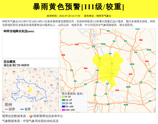 钟祥市气象台2022年07月20日14时13分发布暴雨黄色预警信号:目前钟祥陈安5小时累计雨量已达47毫米,预计未来降水持续,钟祥北部地区部分乡镇及街道雨量将达50毫米以上,山区山洪、地质灾害、中小河流洪水气象风险较高,请注意防范。 信息来源:国家预警信息发布中心; 发布单位:钟祥市气象台。