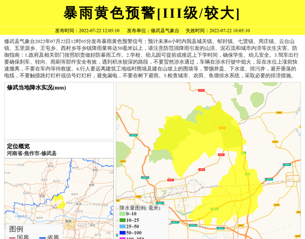 修武县气象台2022年07月22日12时05分发布暴雨黄色预警信号:预计未来6小时内我县城关镇、郇封镇、七贤镇、周庄镇、云台山镇、五里源乡、王屯乡、西村乡等乡镇降雨量将达50毫米以上,请注意防范强降雨引发的山洪、泥石流和城市内涝等次生灾害。防御指南:1.政府及相关部门按照职责做好防暴雨工作。2.学校、幼儿园可提前或推迟上下学时间,确保学生、幼儿安全。3.驾车出行要确保刹车、转向、雨刷等部件安全有效,遇到积水较深的路段,不要贸然涉水通过,车辆在涉水行驶中熄火,应在水位上涨前快速撤离,不要在车内等待救援。4.行人要远离建筑工地临时围墙及建在山坡上的围墙等,警惕井盖、下水道、排污井,避开垂落的电线,不要触摸路灯灯杆或信号灯灯杆,避免漏电,不要在树下避雨。5.检查城市、农田、鱼塘排水系统,采取必要的排涝措施。 信息来源:国家预警信息发布中心; 发布单位:修武县气象台。
