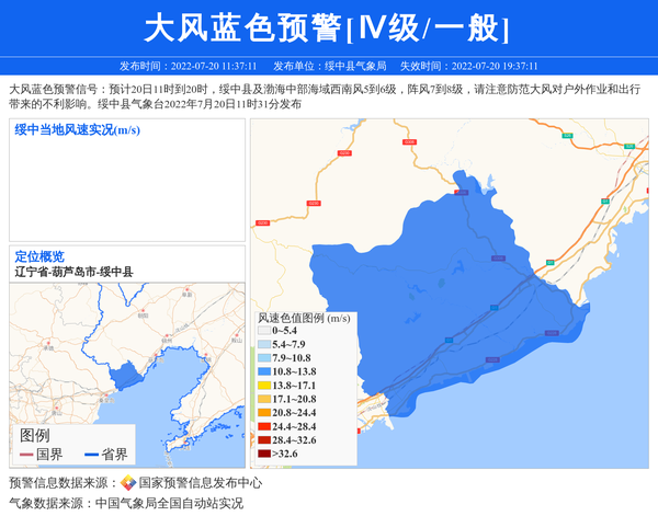 大风蓝色预警信号:预计20日11时到20时,绥中县及渤海中部海域西南风5到6级,阵风7到8级,请注意防范大风对户外作业和出行带来的不利影响。绥中县气象台2022年7月20日11时31分发布 信息来源:国家预警信息发布中心; 发布单位:绥中县气象局。