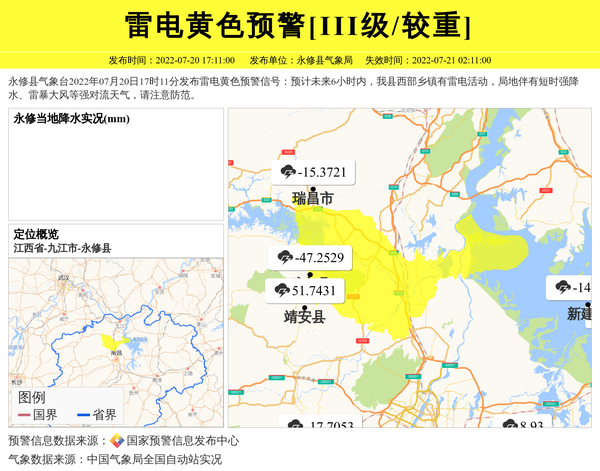 永修县气象台2022年07月20日17时11分发布雷电黄色预警信号:预计未来6小时内,我县西部乡镇有雷电活动,局地伴有短时强降水、雷暴大风等强对流天气,请注意防范。 信息来源:国家预警信息发布中心; 发布单位:永修县气象局。
