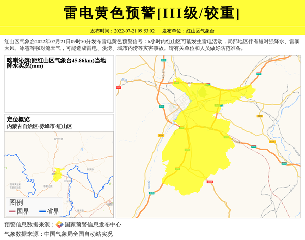 红山区气象台2022年07月21日09时50分发布雷电黄色预警信号:6小时内红山区可能发生雷电活动,局部地区伴有短时强降水、雷暴大风、冰雹等强对流天气,可能造成雷电、洪涝、城市内涝等灾害事故。请有关单位和人员做好防范准备。 信息来源:国家预警信息发布中心; 发布单位:红山区气象台。