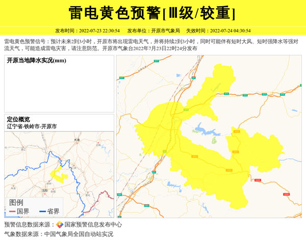 雷电黄色预警信号:预计未来2到3小时,开原市将出现雷电天气,并将持续2到3小时,同时可能伴有短时大风、短时强降水等强对流天气,可能造成雷电灾害,请注意防范。开原市气象台2022年7月23日22时24分发布 信息来源:国家预警信息发布中心; 发布单位:开原市气象局。