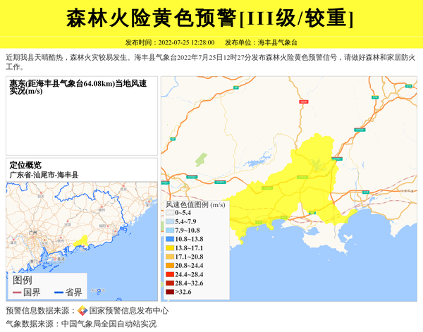 近期我县天晴酷热,森林火灾较易发生。海丰县气象台2022年7月25日12时27分发布森林火险黄色预警信号,请做好森林和家居防火工作。 信息来源:国家预警信息发布中心; 发布单位:海丰县气象台。