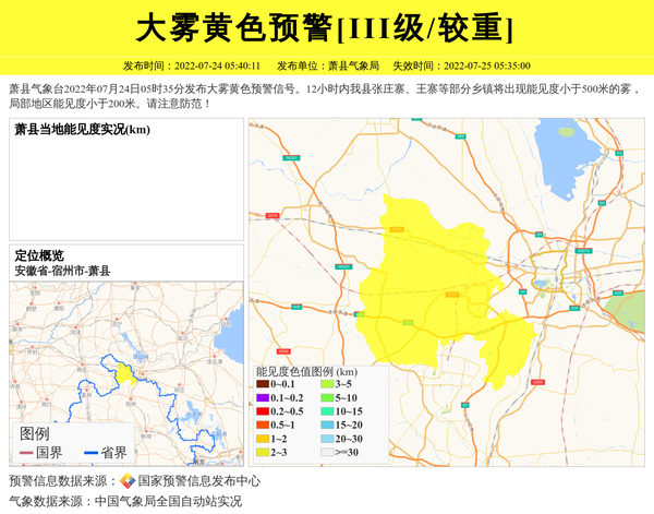 萧县气象台2022年07月24日05时35分发布大雾黄色预警信号。12小时内我县张庄寨、王寨等部分乡镇将出现能见度小于500米的雾,局部地区能见度小于200米。请注意防范! 信息来源:国家预警信息发布中心; 发布单位:萧县气象局。