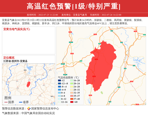 宜黄县气象台2022年07月25日11时22分发布高温红色预警信号:预计未来24小时内,东陂镇、二都镇、凤冈镇、黄陂镇、梨溪镇、南源乡、神岗乡、棠阴镇、桃陂镇、新丰乡、圳口乡、中港镇的部分地区最高气温将达40°C以上,请注意防暑降温。 信息来源:国家预警信息发布中心; 发布单位:宜黄县气象局。