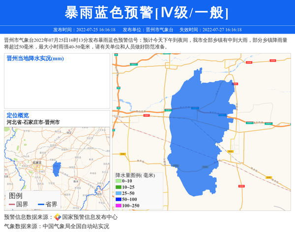 晋州市气象台2022年07月25日16时13分发布暴雨蓝色预警信号:预计今天下午到夜间,我市全部乡镇有中到大雨,部分乡镇降雨量将超过50毫米,最大小时雨强40-50毫米,请有关单位和人员做好防范准备。 信息来源:国家预警信息发布中心; 发布单位:晋州市气象台。